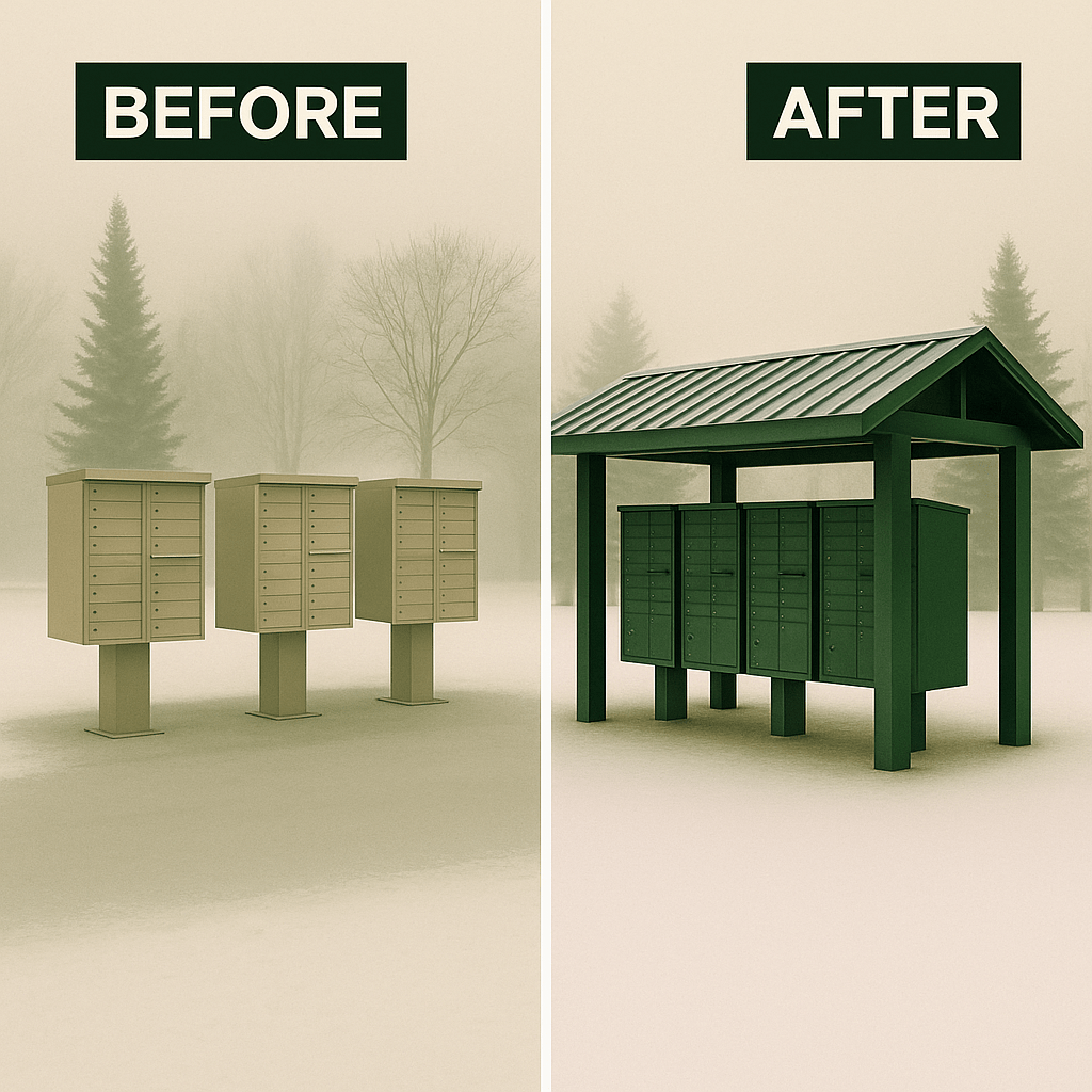 Our cluster mailbox roofs are designed to protect your mailboxes — and your neighbors — from rain, snow, and wind. By providing full coverage and sturdy overhangs, these roofs help prevent water intrusion, rust, and long-term wear, extending the lifespan of your community’s mailboxes while keeping your mail dry and secure.